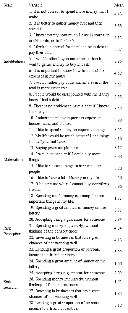 In the questions related to the propensity to indebtedness, materialism, risk perception and risk behavior of the respondents (Table 3), the means of the answers are considered. It should be emphasized that the issues presented in Table 3 already configure the factors forming factors, a step that will be discussed soon.