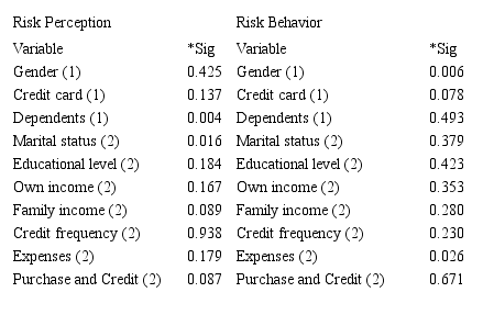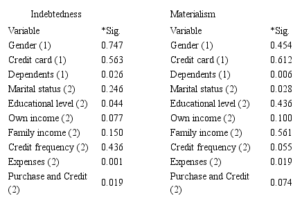 After the creation of the factors, the differences between the socio-demographic and cultural variables were analyzed. Before the tests were carried out, the data were normal through the Kolmogorov-Smirnov test (KS) and it was verified that the sample was not normal, since it presented a value inferior to 0.05, being indicated the accomplishment of not parametric tests. The application of non-parametric tests verified the possible relations between propensity to debt, materialism, perception and risk behavior. Tables 4 and 5 present the Mann Whitney test (1) for up to two groups and the Kruskal Wallis test (2) for more than two groups.