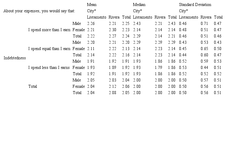 It is evident that the average and median indebtedness of the respondents is in the range of 2 to 3, which represents a more conservative attitude, a result already discussed previously. However, it is also relevant to evaluate in terms of expenditure, gender and municipality. The highest propensity for indebtedness is in individuals who spend more than they earn, who live in Santana do Livramento and who belong to the male gender. In terms of gender, the result corroborates Keese (2012). In view of those who spend less than they earn, consequently, the propensity for indebtedness is reduced. However, it should be noted that, according to the mean (1.93), the female gender surpassed the male in the residents of Santana do Livramento. Thus, the influence of gender on indebtedness is noted, and it is relevant to identify the specific characteristics of men and women in financial terms. In general, the behavior of Brazilians and Uruguayans was similar in the propensity for indebtedness, a fact that may be related to the proximity (geographical, cultural, economic, social) that individuals possess in the Peace Border.
