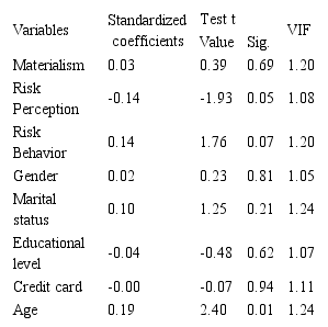 Regarding serial autocorrelation, a coefficient of 1.863 was found, according to the Durbin Watson (DW) test. This coefficient is within the range considered adequate (1.7557 <d<2.243). Also, multicollinearity was verified using the VIF indexes (Table 7), which showed that the variables were close to 1, confirming the absence of multicollinearity. The last tests performed were the Kolmogorov-Smirnov (KS) test and the Weigh-Weigh test. The KS test had a significance of 0.258, indicating the normality of the residues; and the Pesarán-Pesarán test showed a significance of 0.384, proving that the residues have a homoscedastic distribution. It can be stated, after performing the tests, that the multiple linear regression model is adequate. Considering the validity of the model, it is possible to observe the independent variables that present significant coefficients, being the risk perception factor and the variable age.