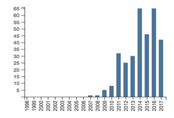 A more specific search was performed in June 2017 in the same Web of Knowledge database, using the key words ‘REDD’ combined with ‘governance’ and ‘forest’ for filtering purposes, resulting in 320 articles. The first article was published in 2007, and the first citation was in 2008, as shown in Figure 1.