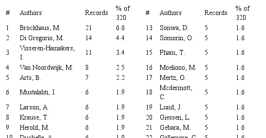 Despite the growing body of literature on REDD+ governance, academic production is incipient and concentrated on a small number of scholars. It is interesting to note that 24 scholars are responsible for 50% of the actual works on REDD+ governance (see Table 1).