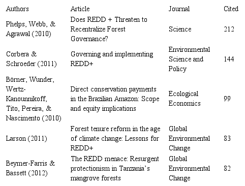The search was refined to articles by researchers from Brazil, resulting in only 19 articles. It is interesting to note that most of these articles have a large number of co-authors, except for the works of Gebara and Agrawal (2017), Roessing Neto (2015), and Cronkleton, Bray, and Medina (2011). This leads us to the conclusion that studies in the REDD+ governance field involving Brazilian scholars have been conducted by research groups. Maria Fernanda Gerbara is the Brazilian researcher that has the highest number of publications, with 26.3% of 19 articles.