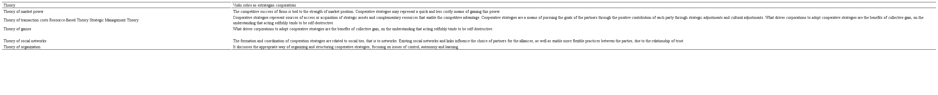 The theories discussed above are some of the lenses through which cooperative strategies between companies can be contemplated. The key points of view for each theory are summarized in Table 1. Overall, the underlying assumption of cooperation as a strategy is that multiple heads and several complementary skill sets acting together are better than acting alone (DOZ; HAMEL, 1998), or by assigning a better position reducing costs; either as a strategic means of achieving objectives or to obtain competitive advantage, the latter being the focus of the present work, as discussed in the next section.