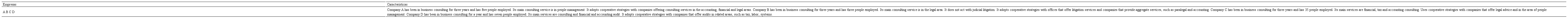 The characteristics of each company interviewed are summarized in Table 2. All of them practice cooperative strategies with partner companies to aggregate missing skills and offer more complete services to their clients. The partner of company A mentioned as motivation of the cooperation strategies the need to expand the portfolio of services and the strengthening of the company's brand. Because the partner companies are, in certain competencies, competitors, said that such cooperative strategies reduce the possibility of both companies competing for the same client, which finds theoretical support in the lens of game theory. In this sense, with the use of such strategies the partner SA said to glimpse that: