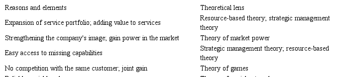 Such motivations are also aligned with the fundamentals of strategic management theory (FAULKNER, 1995; CHILD; FAULKNER; TALLMAN, 2005), resource-based theory (DOZ; HAMEL, 1998) and the theory of market power (Porter, 1980, 1985). As a disadvantage of the practice, the SA partner mentioned the dependency of its company to the partner company, precisely because it does not have the competence that it has, which makes the relationship vulnerable.