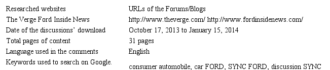 Based on the quality of the comments, it was possible to infer that the number of comments posted was sufficient to subsidize the research. The comments were converted to a document in Microsoft Word software, Times New Roman font, size 12, justified, resulting in 31 pages of content. Table 1 shows the respective sites from which the comments were extracted, retrieved through searches conducted on Google.com website, using the equation “forum” + keywords (consumer automobile, car FORD, SYNC FORD, discussion, and others).