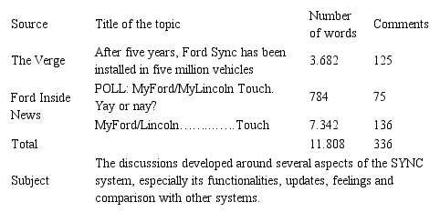 In one of the forums only one discussion was considered for analysis, because it fit the criteria previously established for the study, it had a satisfactory number of respondents and did not present insults or vulgar language. In the other forum, two discussions were considered. Therefore, the corpus of analysis was formed with three (3) discussions. Based on the names and images of the participants’ profile account in the forums, we believe that the sample is formed entirely of male users. All of the participants have cars, most of them are cars with the SYNC system embedded.
