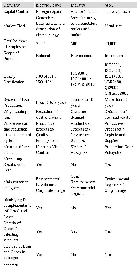 When verifying how the practices of Lean and Green are considered in the strategic planning of the companies, it was found out that two, "Electric Power" and "Steel", consider the results obtained with the application of lean production and environmental management system within their annual strategic planning. They also define targets and indicators to measure these outcomes and evaluate the contribution of these tools for improving organizational productivity.