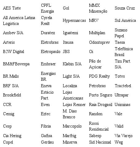 Among the companies that make up the index, those that did not present information on at least one of the variables used in the model during the analyzed period were excluded. We justify the exclusion of incomplete data in the face of the goal of finding a balanced dashboard and improving inference in the results. It is worth noting the fact that some of the firms that make up this portfolio have two shares under negotiation and that, in this case, remained only the one that offered the most liquidity. We obtained a sample composed of 70 companies, over 6 years, making a total of 420 observations. The firms that made up the sample are shown in Figure 1.