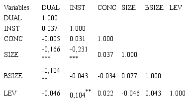 Table 5 shows the correlation matrix between the variables, in order to verify the degree of association between each of the variables. The variable duality of functions (DUAL) is negatively correlated with the variable concentration of ownership (CONC), firm’s size (SIZE), leverage (LEV) and size of the board (BSIZE). According to Brooks (2008), this matrix only indicates the multicollinearity problem when the correlation between variables is higher than 0.8. Thus, it is verified that, in general, multicollinearity does not affect the estimated models, since the variables are not strongly correlated.