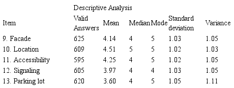 Table 5 presents the descriptive analysis of the level of satisfaction of the five items related to the restaurant's internal environment. As noted in the table above, restaurant location is excellent with an average of 4.51, and with median and fashion equal to 5, the maximum value of the scale. They also obtained good average satisfaction values for accessibility (4.25), façade (4.14) and signaling (3.97). Again, the parking lot got a lower average.