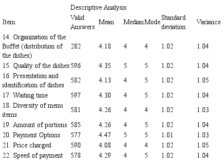 Table 7 presents the descriptive analysis of the level of satisfaction of the nine food related items of the restaurant. All items were well evaluated, with an average of more than four, with emphasis on payment options (4.47) and quality of dishes (4.35).