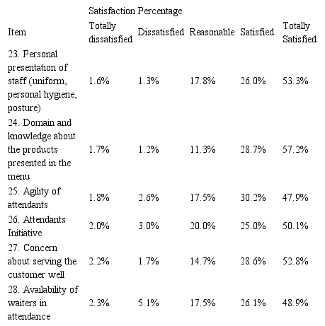 The results found in this study, when referring to the level of customer satisfaction, are in agreement with the following authors: Dube (1994) states that customer satisfaction in restaurants results from a set of attributes, quality of food, variety of menu offered, waiting time, physical environment, comfort, location, service, cost benefit, among others; Schimitt (2000) reports that in addition to serving good quality food the restaurant should provide the customer with a pleasant feeling like flawless presentation of the dish, easy handling of cutlery, decorated surroundings and adequate lighting; for Wakefield, et al. (1994), customers prefer restaurants where they can feed themselves calmly where they can relax at the time of consumption.