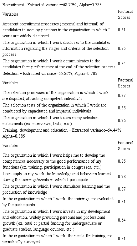 The second factor comprised three variables that presented enunciates of which sense were associated to the idea of selection and related to the set of practices and processes used to choose the candidates. Thus, this factor was determined as selection. Therefore, the recruitment construct is comprised of three variables, the selection construct, by three variables and training, development and education, by six variables.