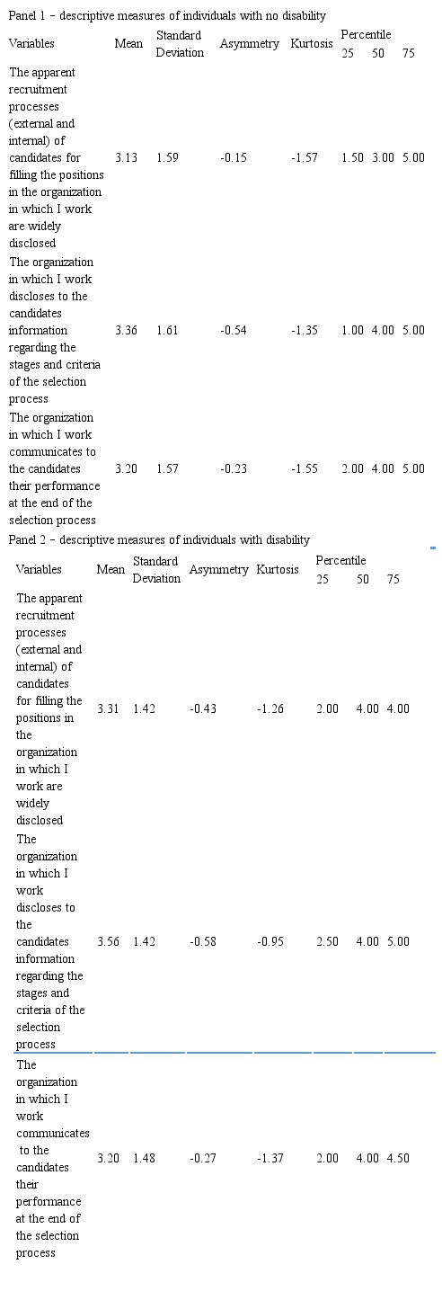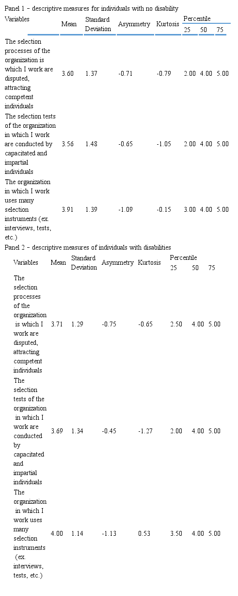 In relation to the position measures, it can be verified that, despite the variables presenting values between 3 and 3.9, they are higher for the variables of the participants with disability, which indicated that the IwD better perceive the application of the variables. Such posture ratifies the behavioral tendency of the companies in relation to the hiring of individuals with disability, given that most rely on the service of consultants for the selection process of these workers (OLIVEIRA, 2008).