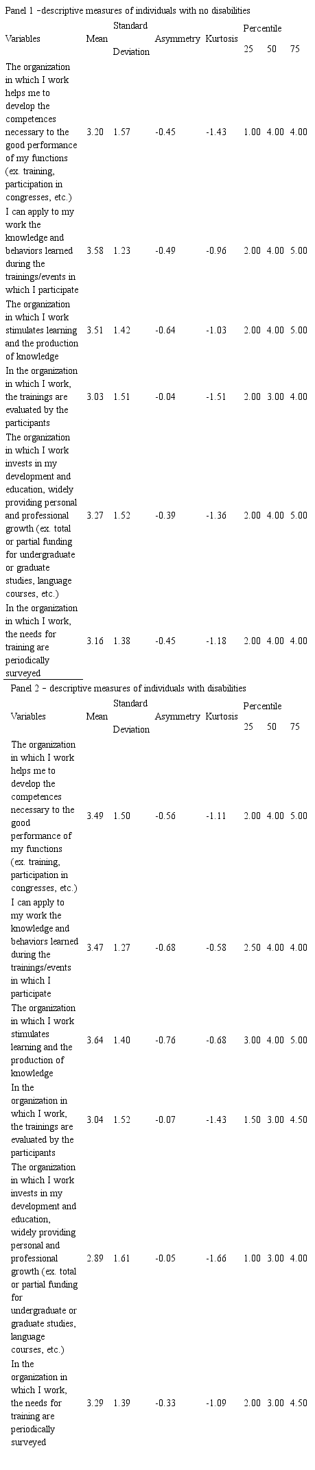 Therefore, it is worth highlighting variable “The organization in which I work invests in my development and education, widely providing personal and professional growth (ex. total or partial funding for undergraduate or graduate studies, language courses, etc.)”, which presents lower scores, average of 2.89 in the first quartile. This suggests that the participants with disability did not perceive the application of this variable.
