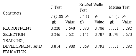 Aiming to identify if the perceptions of the studied groups, individuals with and without disabilities differ in relation to the constructs concerning personnel management policies and practices of the organizations in which they work, the parametric technique of analysis of variance (ANOVA) and non-parametric techniques of Kruskal-Wallis and median tests. With these techniques, the reference measures (with p-value>0.05) were extracted for verifying the difference between groups. Table 6 presents the results of the performed tests.