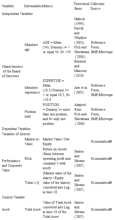 The data set, related to the variables described in Table 1, was collected in the 2016 Reference Form, which focuses on the data for the year 2015. The data collected, regarding the 128 companies that make up the research population, were restricted to the name, age, position(s) and experience of the members of the Board of Directors.