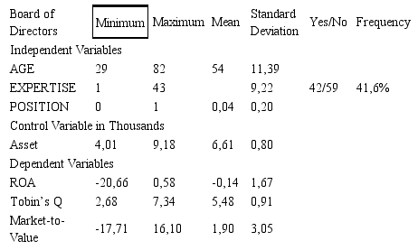 Table 1 presents the results of the descriptive statistics of the variables of the Board of Directors. These variables were calculated as shown in Table 1. If there were no observations about the individual, it was decided to eliminate it from the analysis.