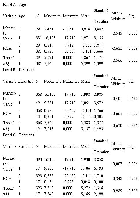 According to the Mann-Whitney test, the variables Expertise and Number of Positions were not significant for differences in performance averages, that is, the companies in the sample showed no difference in performance when their members of the Board of Directors were more or less occupied, even when they had greater experience within the organization.