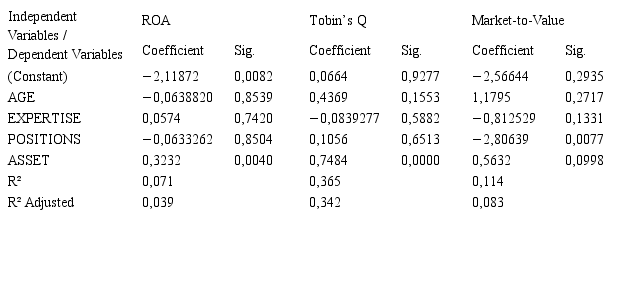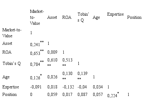 The Market-to-Value performance indicator was correlated with the Total Asset variable, with the variable Tobin’s Q and with the Age of members. The dependent variable Tobin’s Q was correlated with the variables Total Asset and Return on Asset. The independent variable Age correlated with Tobin's Q and Asset Profitability. And the dependent variable Position correlated at the significance level of 5% with Expertise.