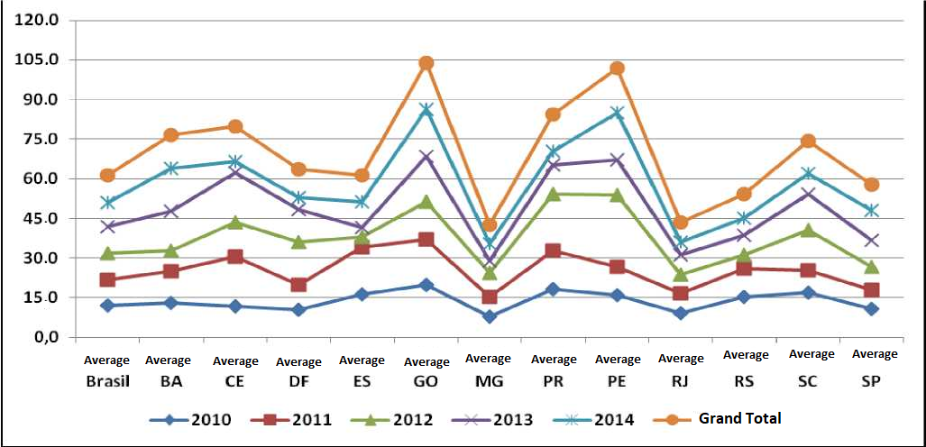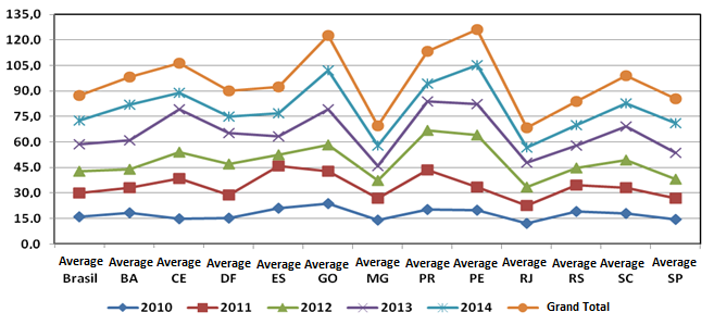 The line chart below shows the annual average from 2010 to 2014 for Brazil and the analyzed states.