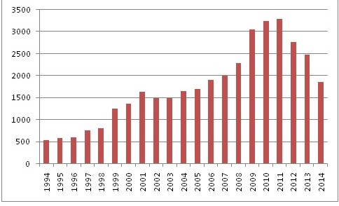 Regarding the survey carried out at Jucergs, the following table shows the total number of beauty companies established per year, from 1994 to 2014. Next, a bar chart shows the growth of the sector. The companies' description is grouped by year according to the CNAE codes highlighted in Table 5 above. Table 6 below shows the total number (sum of all activities recorded according to CNAE codes) year by year, from 1994 to 2014.