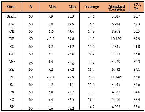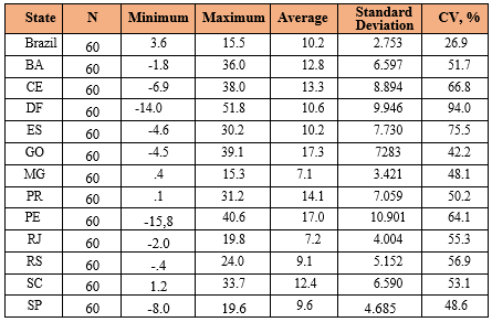 The following table contains descriptive statistics extracted from the table Net Sales Variation in Retail Trade, by Activity and State, in percentage terms (from January 2010 to December 2014). The data are from the IBGE PMC report regarding the monthly production of "pharmaceutical, medical, orthopedic, perfumery and cosmetic products". The number of observations (N), minimum and maximum values, mean, standard deviation and coefficient of variation (CV,%) were calculated.