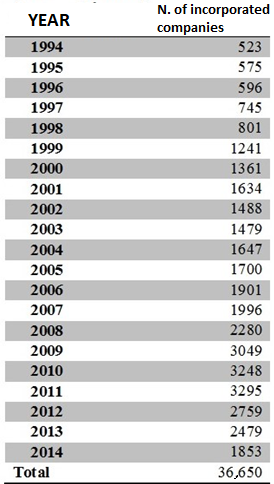 The following indications were extracted from a Microsoft Office Excel 2010 spreadsheet. This work was carried out with the help of a statistician, who reviewed data and results. We selected the Institute that gathers data deemed most relevant in the state of Rio Grande do Sul – JUCERGS -, through a data report requested to them. Thus, the sample is composed of new companies operating in the beauty industry, registered each year at JUCERGS, from 1994 to 2014. In this case, the time frame refers to the period for which the Institution has cataloged data.