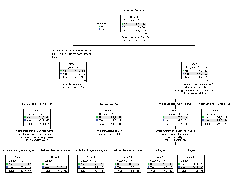 Considering the first analysis of the classification tree, we note university students with entrepreneurial intention: students who have self-employed parents (entrepreneurs in the immediate family) (normalized importance of 74.1%); students who are indifferent regarding the barriers to entrepreneurship (standardized importance of 69.6%); and agree on the importance of environmental protection (standardized importance of 50.5%). This is the most obvious group with entrepreneurial intention.