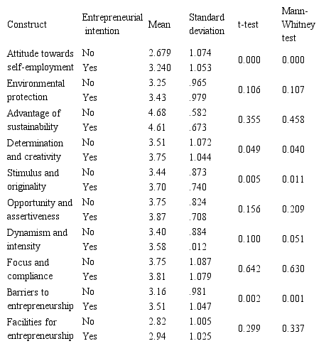 In this analysis, the hypothesis test is performed to compare the level of agreement between students who have entrepreneurial intention and those who do not, considering the dependent variable ("self-employed or have the intention to become self-employed within the next 5 years") in the independent variables extracted from each factor.