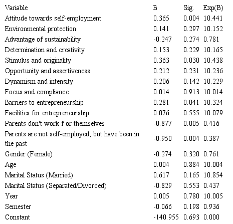 From the logistic regression analysis, the independent behavioral and sociodemographic variables are used to predict the dependent variable: "I am self-employed or intend to become self-employed in the next 5 years" in the model employed in this study. This analysis supports the viability of the model, as well as highlighting its significant aspects to evaluate the hypotheses. Table 10 shows the results of the logistic regression, considering the most significant variables (p-values less than 0.1) used for the suitability of the variable in the model.