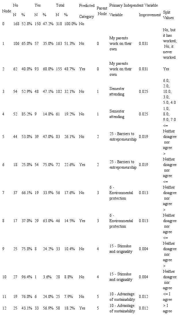 Also noteworthy is Table 11, which is similarly related to CART, and addresses several aspects evidenced in the tree, namely: the nodes, highlighting the comparison of entrepreneurial intention and its absence; the independent variables; the improvement values that each variable represents; and the division values.