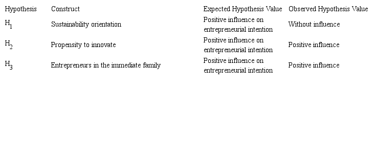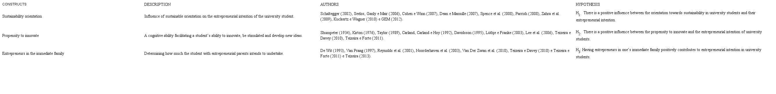 The perspectives of Teixeira and Davey (2010), Texeira and Forte (2011) and GEM (2012) all address differences in entrepreneurial intention due to cultural factors inherent in the characteristics of each country. The hypotheses of this study will be tested and accepted or rejected to verify the influence of behavioral constructs of sustainable entrepreneurship in the entrepreneurship intention of university students.