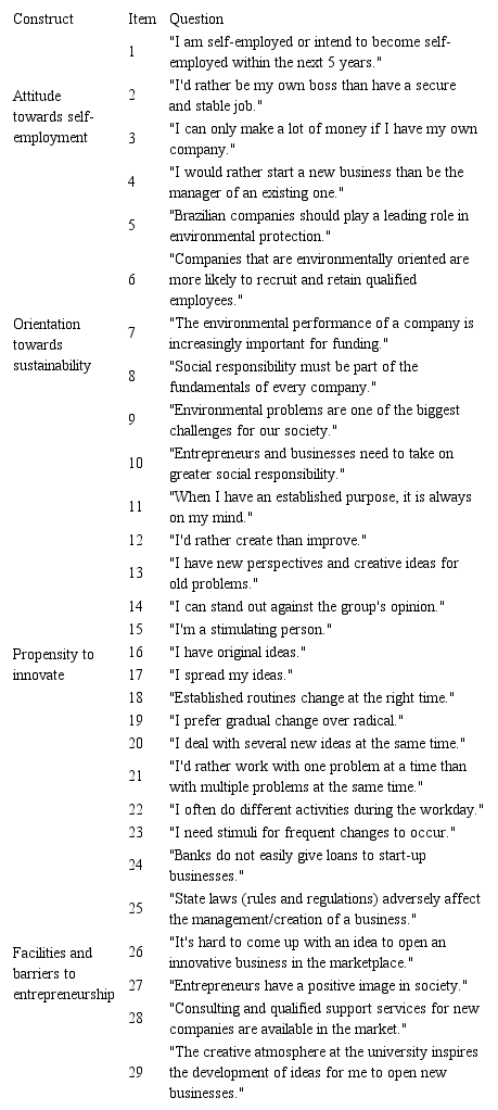 The administration course, using the evidence of Paço et al. (2011), presents a wide incidence of studies and practices related to entrepreneurship and can contribute significantly to the formation of entrepreneurs, which supports the justification of the choice of this course for the chosen population. For this research, we took into account the methodology applied by Kuckertz and Wagner (2010), adopting a set of items that measure five behavioral constructs of sustainable entrepreneurship: attitude towards self-employment; orientation towards sustainability; propensity to innovate; barriers and facilities for entrepreneurial activities; and entrepreneurs in the immediate family.