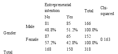 Regarding the profile of the sample, there are 166 male students, representing 57.2% of the sample, of which 85 have entrepreneurial intentions and 81 do not. Moreover, there are 152 female students (47.8%) in the sample, of these 65 have entrepreneurial intentions and 87 do not. In the sample of 318 students, a total of 150 have entrepreneurial intentions, most of whom are men (see Table 3).