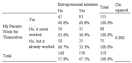 Considering the relationship between self-employed parents and entrepreneurial intention in university students, 155 have entrepreneurial parents, and of these, 93 have entrepreneurial intention (60%) but 63 do not (40%); 88 students do not have entrepreneurial parents. Of these, 56 students have no entrepreneurial intention (63.6%) but 32 do (36.4%). Students with parents who have worked for themselves, but who have employed no other individuals, total 75 (50 of these students have no entrepreneurial intention; 66.7%) (see Table 4).
