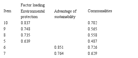 In reference to the second construct, sustainability orientation, it achieved a KMO of 0.762 and a significance level for Bartlett's sphericity test of 0.000, observing its division into two factors, one related to environmental protection (item 10: "Entrepreneurs and companies need to assume greater social responsibility"; 0.837 factor loading), and the other to the advantage of sustainability (item 6: "Companies that are environmentally oriented find it easier to recruit and retain qualified employees"; 0.851 factor loading), with 61.11% of the explained variance (as seen in Table 6).