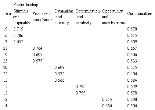 The first construct, attitude towards self-employment, presents a Kaiser-Meyer-Olkin (KMO) value of 0.588 and a 0.000 significance level for Bartlett's sphericity test. These results indicate the suitability of the sample for the use of factor analysis in this construct since the KMO was greater than 0.5 and Bartlett’s sphericity test showed an interior significance level of 0.05. Item 4, "I would rather start a new company than be the manager of an existing one", has a higher factorial loading, so it was chosen as a substitute variable (0.847 factor loading). This construct holds 58.031% of the explained variance (see Table 5).