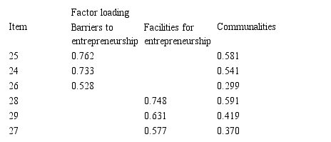 The fourth construct, barriers and facilities for entrepreneurial activities, has a KMO of 0.541 and a significance level for Bartlett's sphericity test of 0.000. This construct was divided into two factors, in which the first highlights the perceived barriers to entrepreneurial activities; removing item 25 ("State Laws (rules and regulations) are adverse to the management/creation of a company"; 0.762 factor loading) as a substitute variable, and the second, item 28, considers entrepreneurship facilities ("Consulting and qualified support services for new companies are available in the market"; 0.748 factor loading) being the substitute variable. The variance explained in this construct is 46.68% (Table 8).
