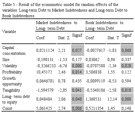 After the presentation of Table 4, there is the need to present the results of the econometric model for random effects of the variables: Long-term Debt to Market Indebtedness and Long-term Debt to Book Indebtedness. These new results can be viewed and pointed out through Table 5.