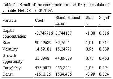 For a final analysis, Table 6 shows the econometric model result of pooled data of the Net Debt/EBITDA variable. The results obtained do not present any significant nominal level, that is, it does not allow signaling any type of influence on net debt to EBITDA.