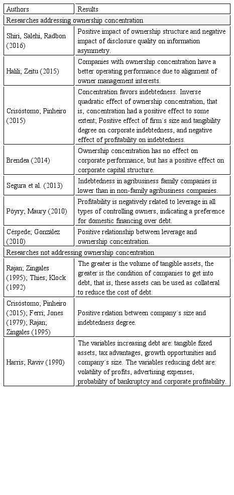 Noteworthy is that the relation between capital and ownership structures has yet to be explored (DRIFFIELD; MAHAMBARE; PAL, 2005), justifying the efforts to expand research on the theme, especially in Brazil. There is a statistically significant influence of the shareholding control structure on capital structure decisions and the influence of variables related to profitability, size, year and sector (PROCIANOY; SCHNORRENBERGER, 2004). Demsetz and Villalonga (2001) argue that business performance cannot be duly interpreted if disregarding the influence of ownership structure. Capital concentration reduces the number of decision makers (controlling owners) and, as a result, tends to provide better management for companies, affecting on the reduction of gross and net indebtednesses (CÉSPEDE; GONZÁLEZ, 2010, PÖYRY; MAURY, 2010; BRENDEA, 2014; HALILI; ZEITU, 2015).