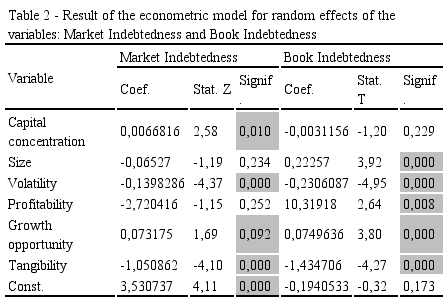 After evidencing the descriptive statistics of the study variables, the analysis and discussion of the econometric models are performed in relation to the theoretical framework. For this, Table 2 is elaborated presenting the result of the econometric model for panel data with random effects (chosen after applying the identification tests of the most appropriate model) of the variables: Market Indebtedness and Book Indebtedness.