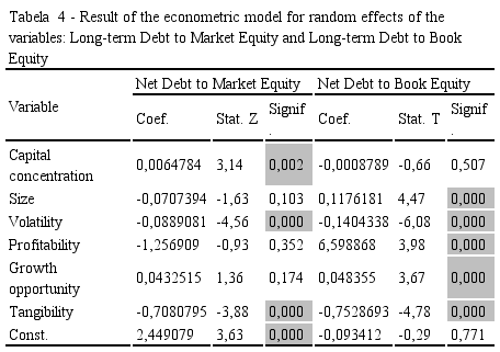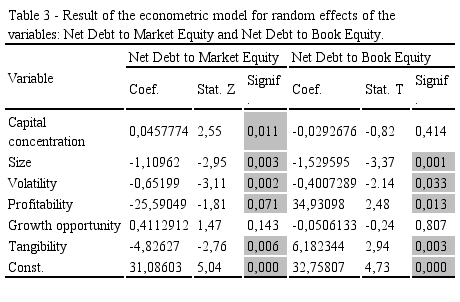 Table 3 shows that, while net debt to market equity presents the variables of market concentration, size, volatility, profitability and tangibility with nominal level of significance, net debt to book equity presents only the capital concentration and corporate growth opportunity without any significant nominal level.