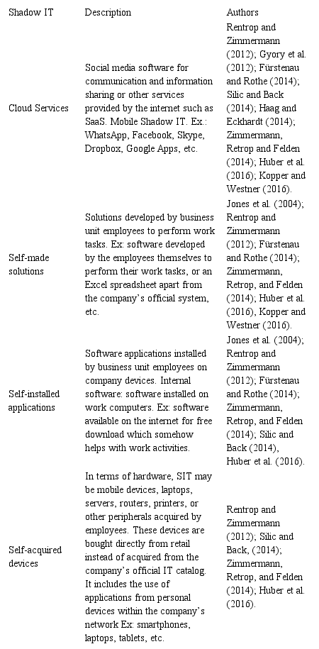Shadow IT is an IT solution utilized by any employee to perform their work tasks without the approval and formal support of the company’s IT department (Rentrop; Zimmermann, 2012; Györy et al., 2012; Walters, 2013; Silic; Back, 2014; HAAG; Eckhardt, 2017). It is a generalized phenomenon that includes systems, services, and processes that are not a part of companies’ “official IT” (KOPPER; WESTNER, 2016). Shadow IT are solutions such as an application installed at the workplace, a spreadsheet, a database solution, cloud service, peripheral devices, a combined solution, or a legacy system (HUBER et al., 2016). Considering the variety of occurrences, Table 1 provides a breakdown of the types of Shadow IT, according to the literature.