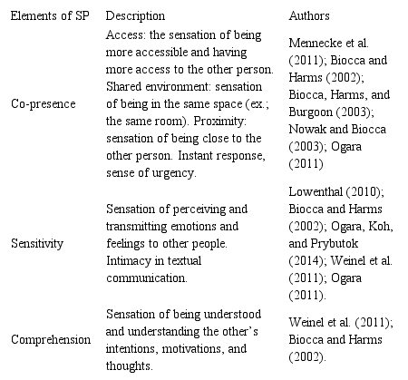 Considering all the researched authors, the elements of SP were listed for this study. The concept, as well as the measurement, of the sense of social presence is still in construction, inasmuch as the authors that write about social presence seem to define and measure it differently (Lowenthal, 2010). In this study, Social Presence is observed considering the following elements: co-presence, sensitivity, and comprehension.