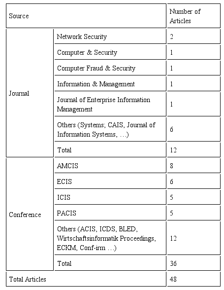 Table 1 presents the selected articles relevant to this study. Forty-eight articles were selected based on the research criteria. As the table demonstrates, the vast majority of articles on Shadow IT are from international conferences, while only a minority has been published in journals.