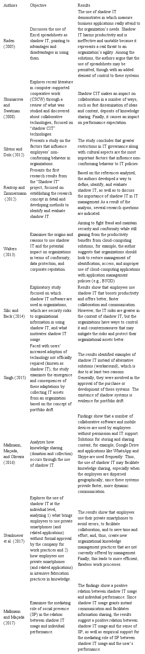 The results of the literature review disclosed in Table 4 offer evidence of the relation between Shadow IT and collaboration. A large part of the collaboration and communication technologies utilized by the users in the organizations – such as instant message software and cloud storage (Dropbox and Google Drive) – figure as Shadow IT (Walters, 2013; Silic; Back, 2014; Mallmann, Maçada; Oliveira, 2016). One of the occurrences of Shadow IT is the use of “Social Media Software” for communication and information sharing or other services offered by internet providers, for example, cloud services (Rentrop; Zimmermann, 2012). Means of synchronized communication, such as instant messages, offer an experience similar to talking to someone face-to-face, including response speed, explain Shumarova and Swatman (2008).